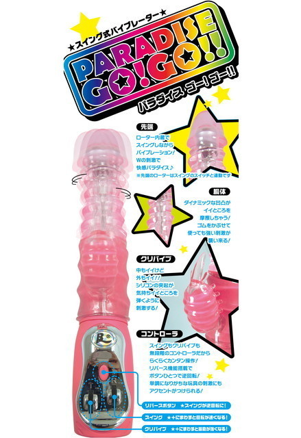 スイングバイブの先端にローターが入っちゃいました!ぐりぐりと回転しながらぶるぶる振動!Wの刺激で快感パラダイス♪クリバイブも無段階コントローラで簡単操作!リバースボタンつき!