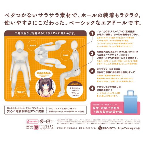 ベタつかない、使いやすいエアドール KUU-DOLL[くうドール]が登場!ベタつかないサラサラ素材で、ホールの装着もラクラク。使いやすさにこだわった、ベーシックなエアドールです。業界最大径の長さ14.5cm、幅7cmの大口径ホールポケット。小型ホールから大型ホールまで使えます。肌に触れるものだから、安心の環境調和型PVCを使用。保管・収納に便利な不織布製収納袋も付属。